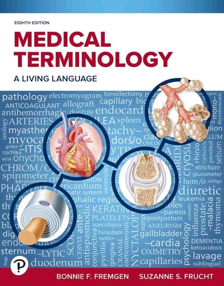 Organized by body system, the text places medical terms within an A&P context. Instead of memorizing terms, you’ll learn how to use word parts to build terms, to decode unfamiliar language. The 8th Edition features a new Professional Profile section at the start of each chapter exploring career options per medical specialty. A reintroduced Special Topics chapter covers medical terms relevant to pharmacology, mental health, diagnostic imaging, rehabilitation, surgery and oncology. Additionally, a new Medical Care section discusses the study and treatment of diseases.Medical Terminology: A Living Language 8th Edition is written by Bonnie F. Fremgen; Suzanne S Frucht and published by Pearson. ISBNs for Medical Terminology: A Living Language are 9780138029814, 0138029814 and the print ISBNs are 9780138030018, 0138030014. Additional ISBNs include 9780138053123.